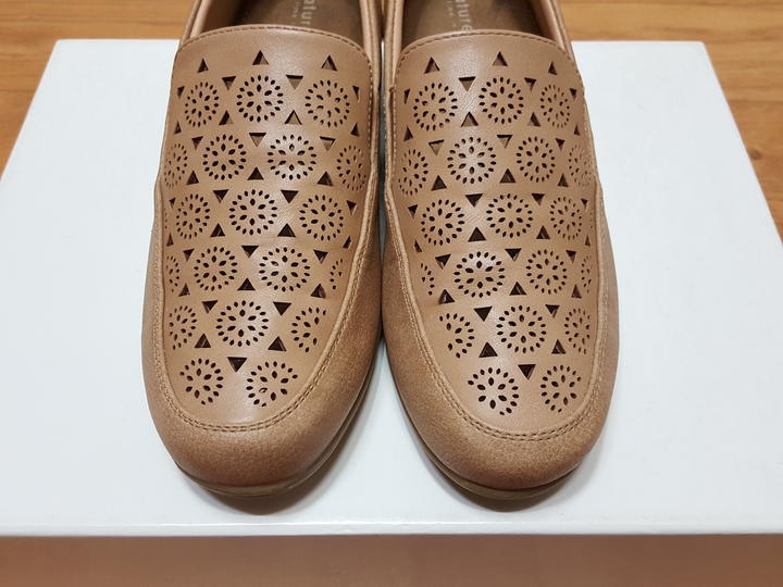 인조가죽인데요,, 소프트(말랑)해서 살짝 늘어나는 느낌도 있고 착화감 좋은 재질이며,, 밝은 계열의 예쁘고 세련된 낙타색이예요..