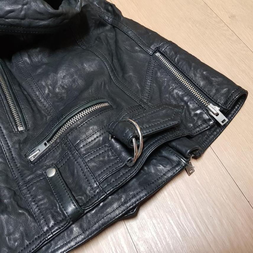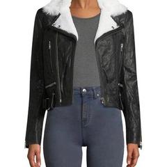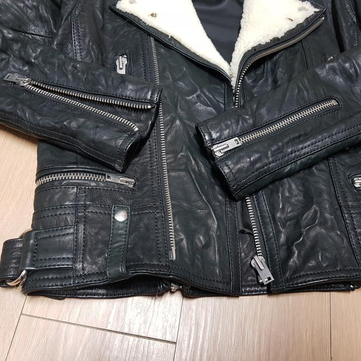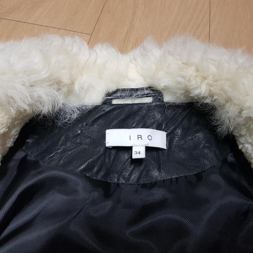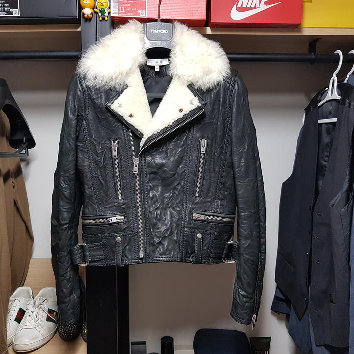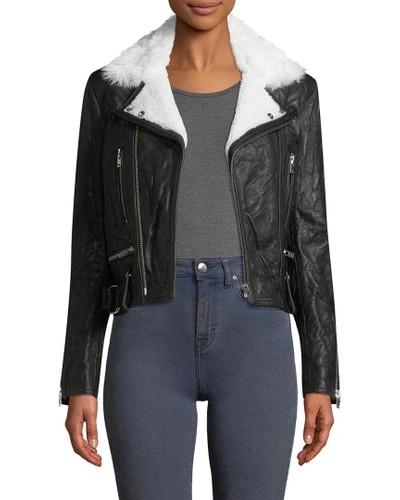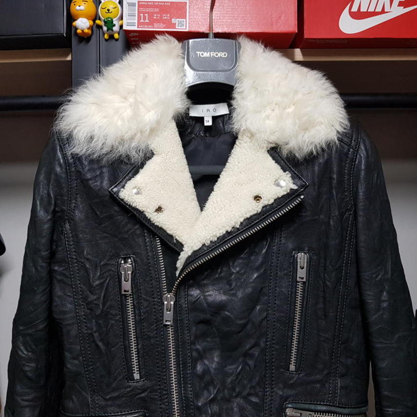 IRO NOEMIE SHEARLING TRIMMED TEXTURED LEATHER BIKER JACKET/이로 NOEMIE 양가죽 양털트리밍 구김질감 여성바이커자켓/34(90권장)