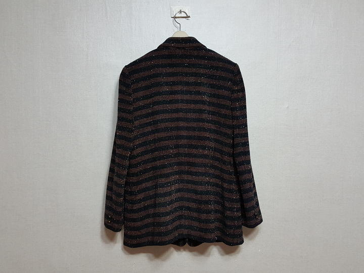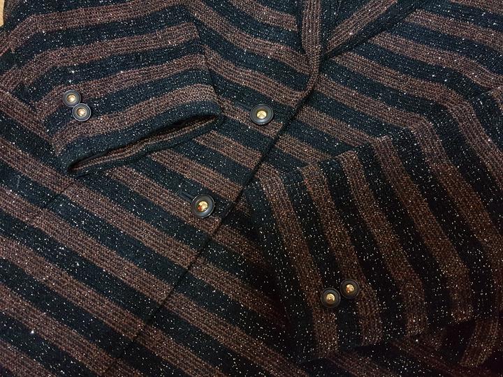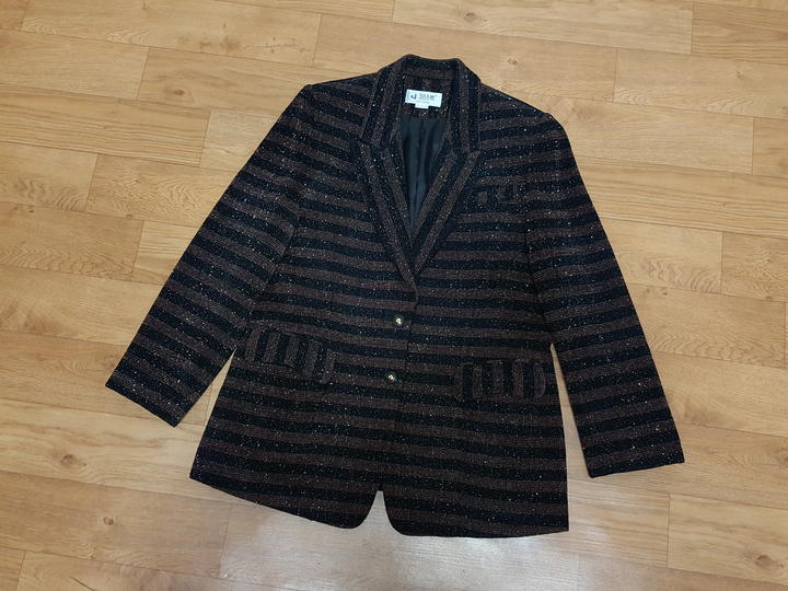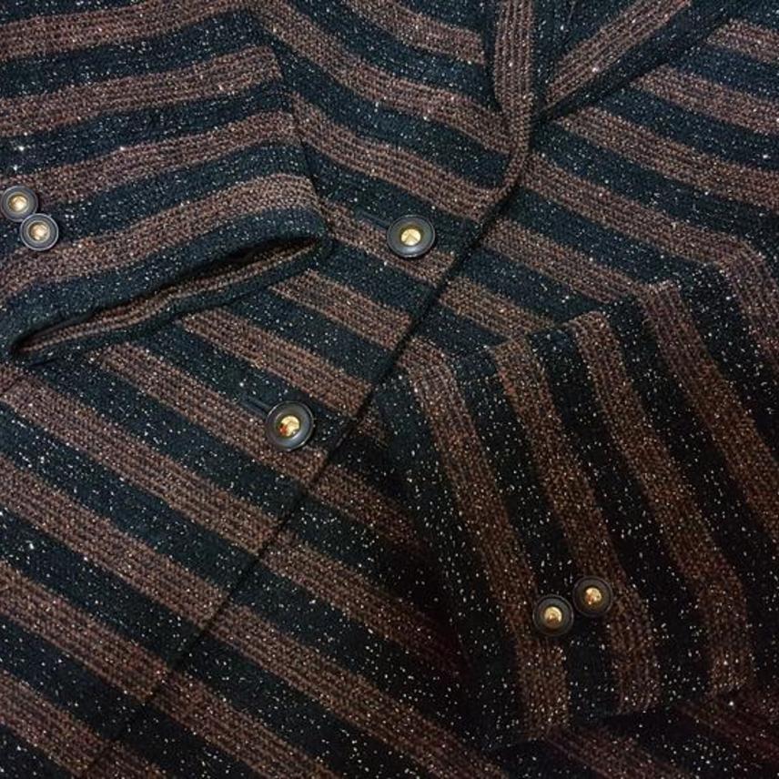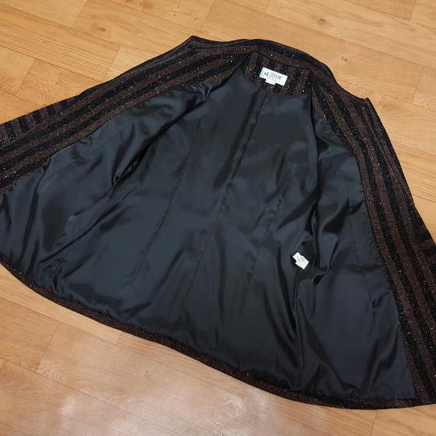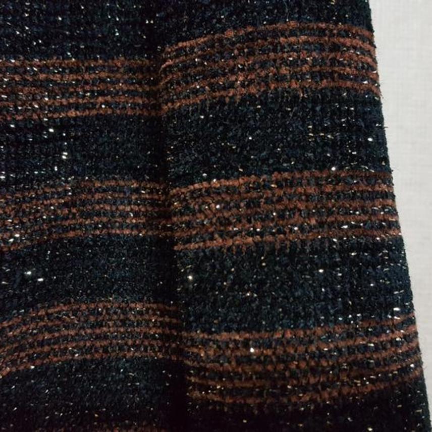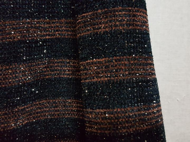 트위드라서 구김염려없고 신축성도 있어 착용감 편하고요,, 블랙과 브라운 스트라이프에 골드펄 있어 예뻐요..