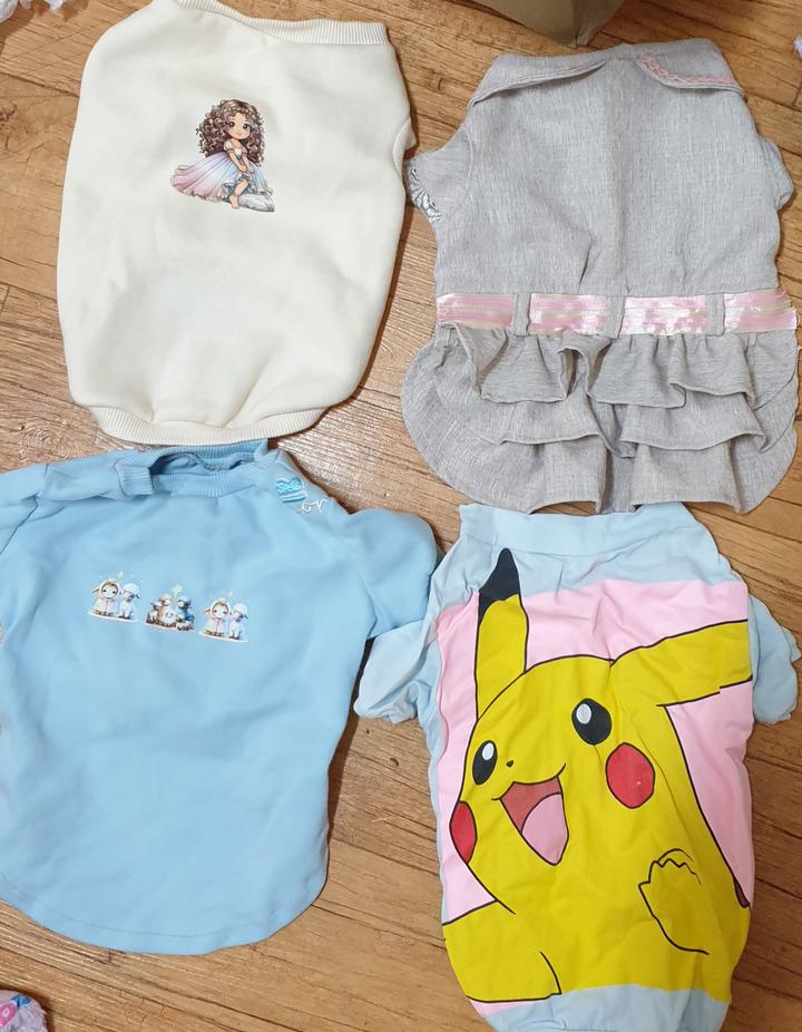 강아지 옷 네 벌 일괄 판매합니다. 흰색, 회색, 하늘색 등 색상도 다양하고 디자인도 귀여워요. 피카츄 옷도 있으니 눈여겨 봐주세요! 문의 없으시면 바로 안전결제해주시면 됩니다!