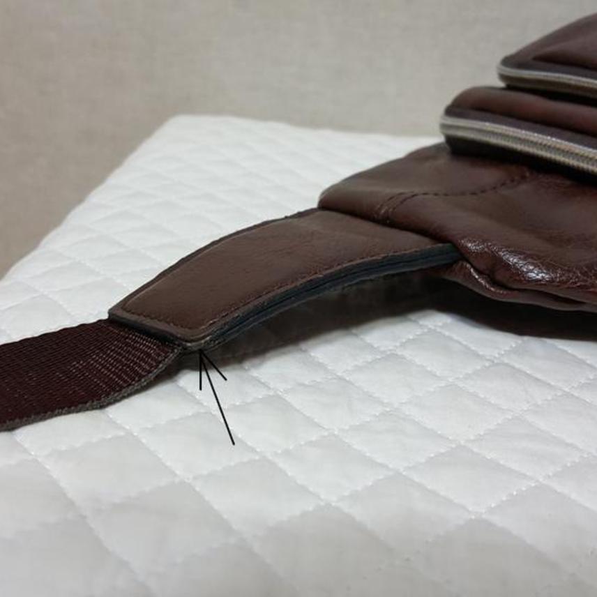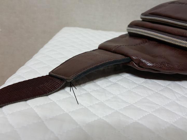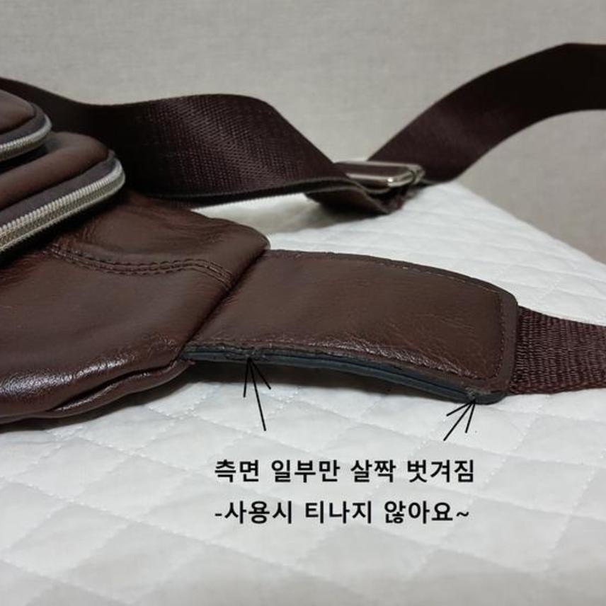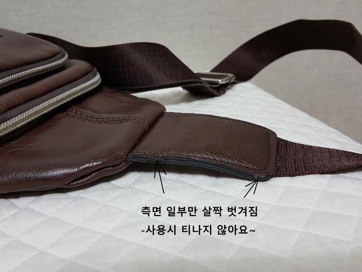 상단 끈연결 가죽 측면 모서리 부분(근접사진 표시부분)에만 살짝 흠 있을 뿐,, 닳음이나 이염같은 것은 없고 깨끗해서 상태 좋아요..