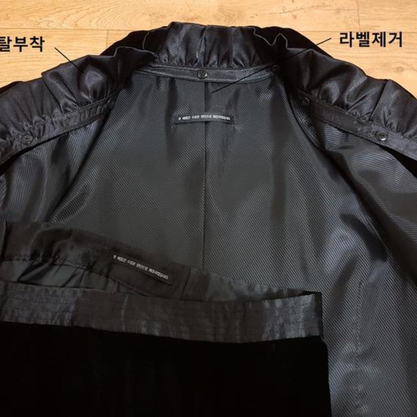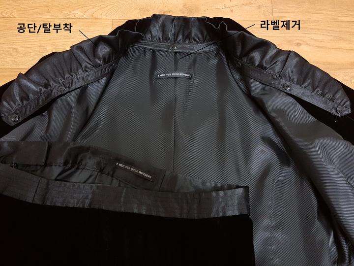 카라 안쪽의 공단 셔링은 탈착식이며,, 자켓 밑단과 스커트 허리부분에도 동일 공단으로 되어 있어요..