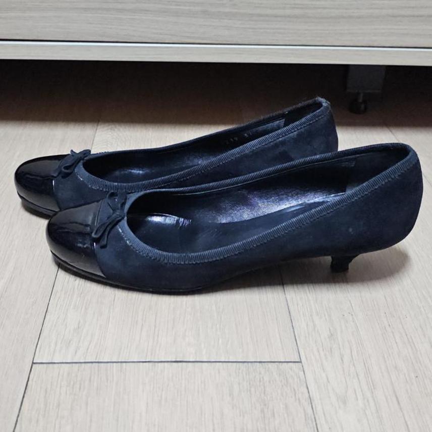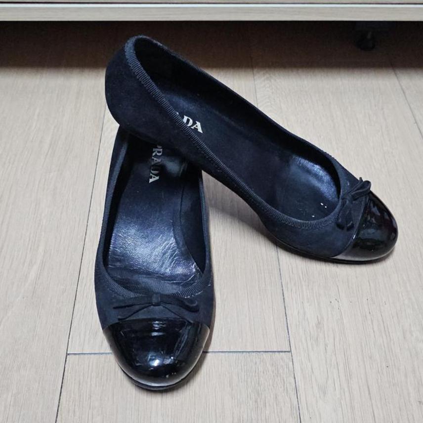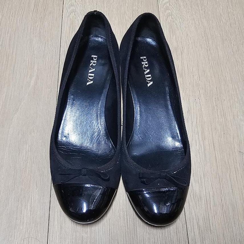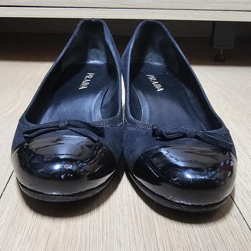 프라다 블랙투톤 페이던트+스웨이드 리본장식 여성플랫힐 240