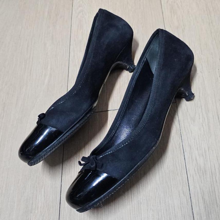 PRADA/프라다/이태리정품/블랙투톤/페이던트+스웨이드/굽높이3센티/리본장식/여성플랫힐/37(240)