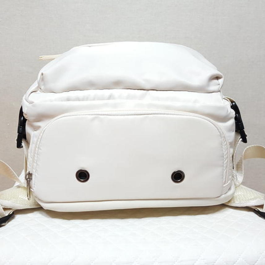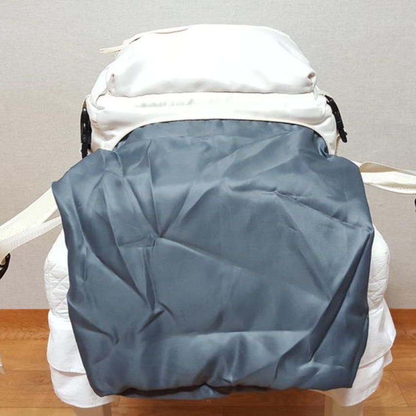 30*43*15cm,, 도톰하고 은은한 광택감이 도는 나일론?원단이며,, 화이트 아니고 예쁜 미색이고요,, 가벼워요..